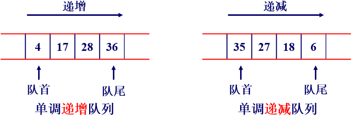 单调队列中的元素从队首到队尾始终保持单调性(单调递增或单调递减),队首元素是所有队列元素中的一个最值(单调递增队列的队首元素是所有队列元素中的最小值,单调递减队列的队首元素是所有队列元素中的最大值)。